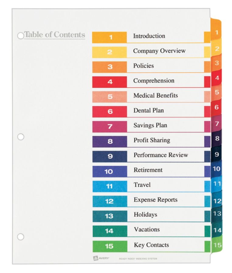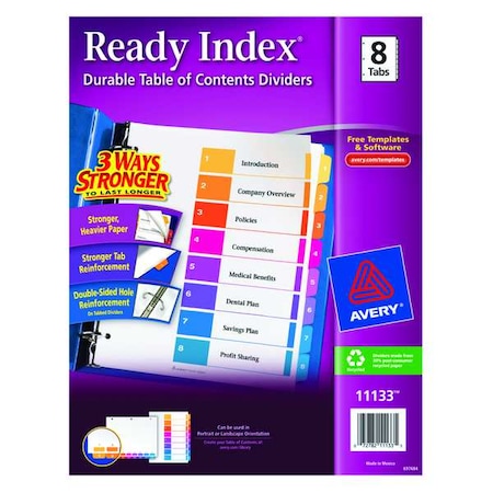 We also keep a full line of TAA compliant products. Three-hole punched for use in standard ring binders. Avery makes it easy for you to customize and print your table of contents page from almost any computer or tablet.