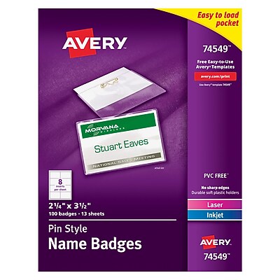 Avery Name Badge Template 74549. Name Badge Kits-Safety-Pin-On Card Holder Kit. I used the Avery name badge template (free on the Avery website) and printed the name badges on the inserts.
