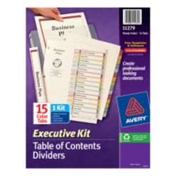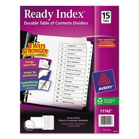 Avery Ready Index 15 Tab Template Color. These Ready Index Table of Contents Dividers help you stay organized so you can locate documents quickly and efficiently. The coordinated system of a reinforced Table of Contents page and matching preprinted colorful tab.