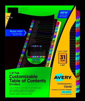 Each tab is preprinted and uniquely color coded for a professional Avery Ready Index Table Of Contents Dividers help you organize your home office or virtual classroom so you can be productive anywhere. Using free templates from Avery Design & Print you can customize the included. Dividers are three-hole punched for use in binders.