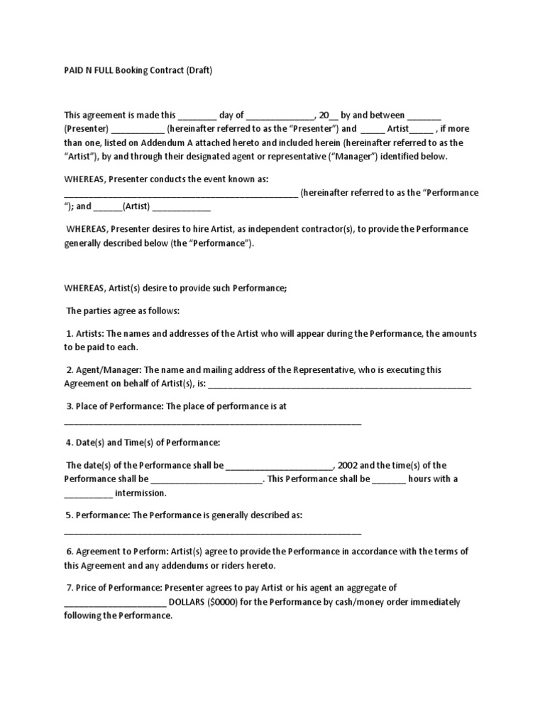 Artist Booking Contract Sample. Artist Booking Contract - Free download as Word Doc (.doc /.docx), PDF File (.pdf), Text File (.txt) or read online for free. This pertains to the agent's role in providing booking services to the talent that will help the latter appear and do performances in.
